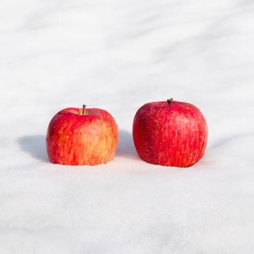 300gから400gほどと大き目で、果皮は赤色です。お尻に丸みがあり緑色からオレンジ色、黄色へ変化したら熟した証拠になります。果皮の赤色がまだらなものや傷があるものは見た目は悪いですが、甘さに影響はありません。大きすぎず中玉でずっしり重いものがおいしいりんごです。